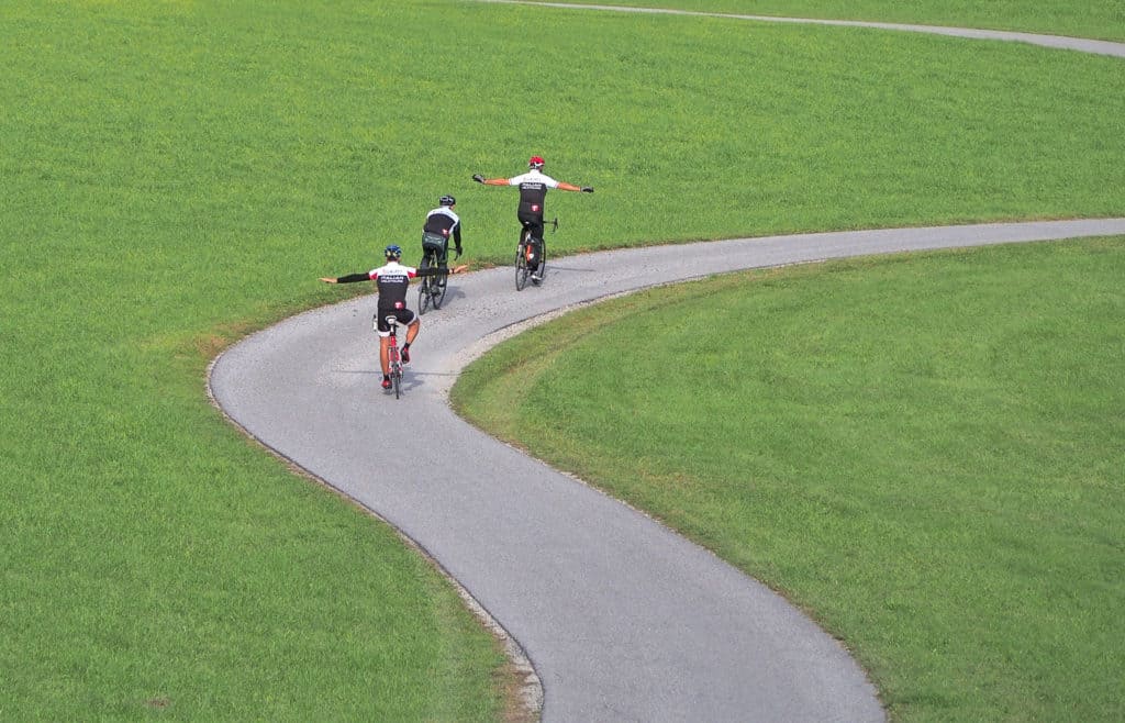 In curva il peso va ‘teso’ sul pedale esterno ma il corpo asseconda il movimento del mezzo: non siete Valentino Rossi su una moto da due quintali, siete Mario Rossi su una biga da 7-10 chili.