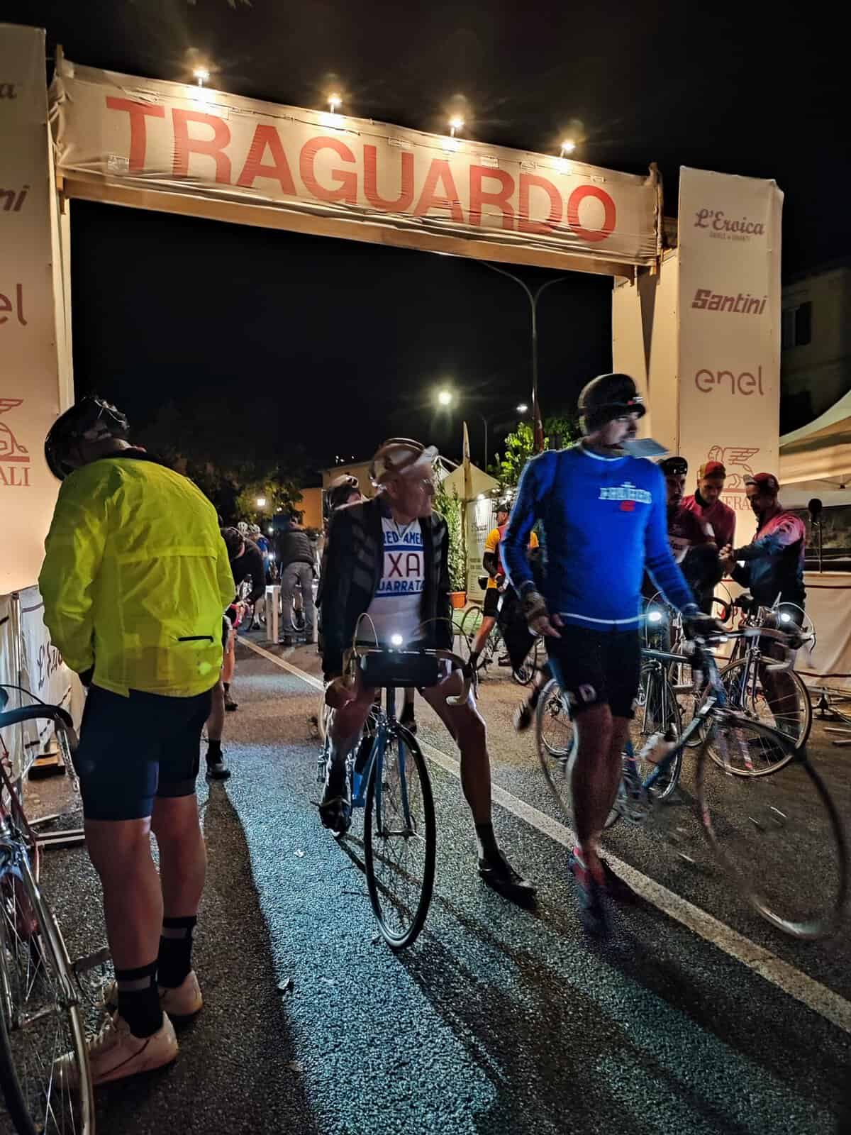 Eh già! Perché se l’evento è d’epoca, pure la bici e l’abbigliamento devono esserlo! Generalmente i regolamenti prevedono l’utilizzo di biciclette ante 1987, con gabbiette ai pedali o comunque senza sgancio rapido, leve del cambio (se presenti) sul telaio, indumenti di lana o comunque non moderni; le uniche eccezioni teoricamente previste sono il casco omologato e le luci (per chi volesse riferimenti più dettagliati, si trovano nei regolamenti degli eventi organizzati).