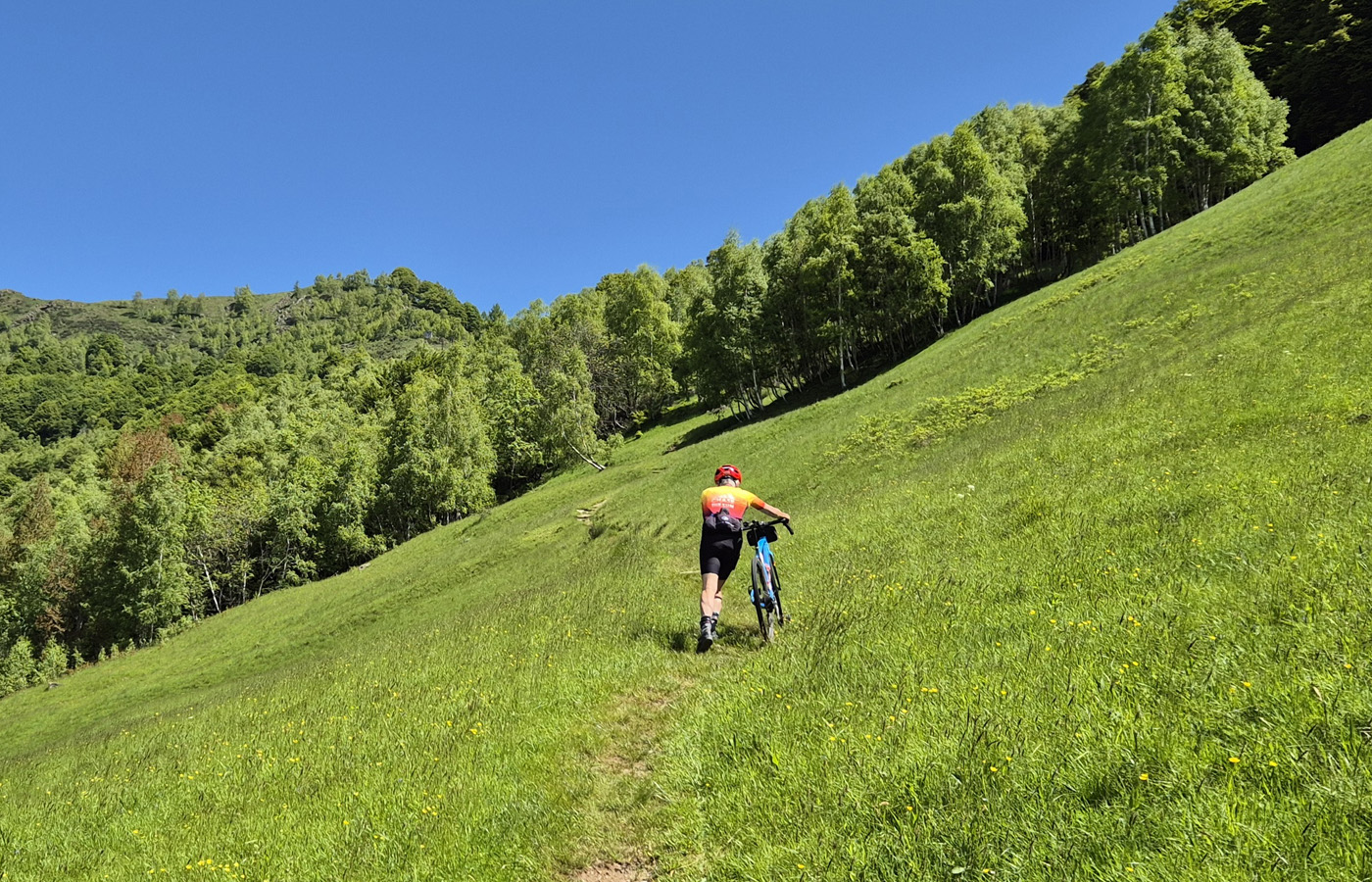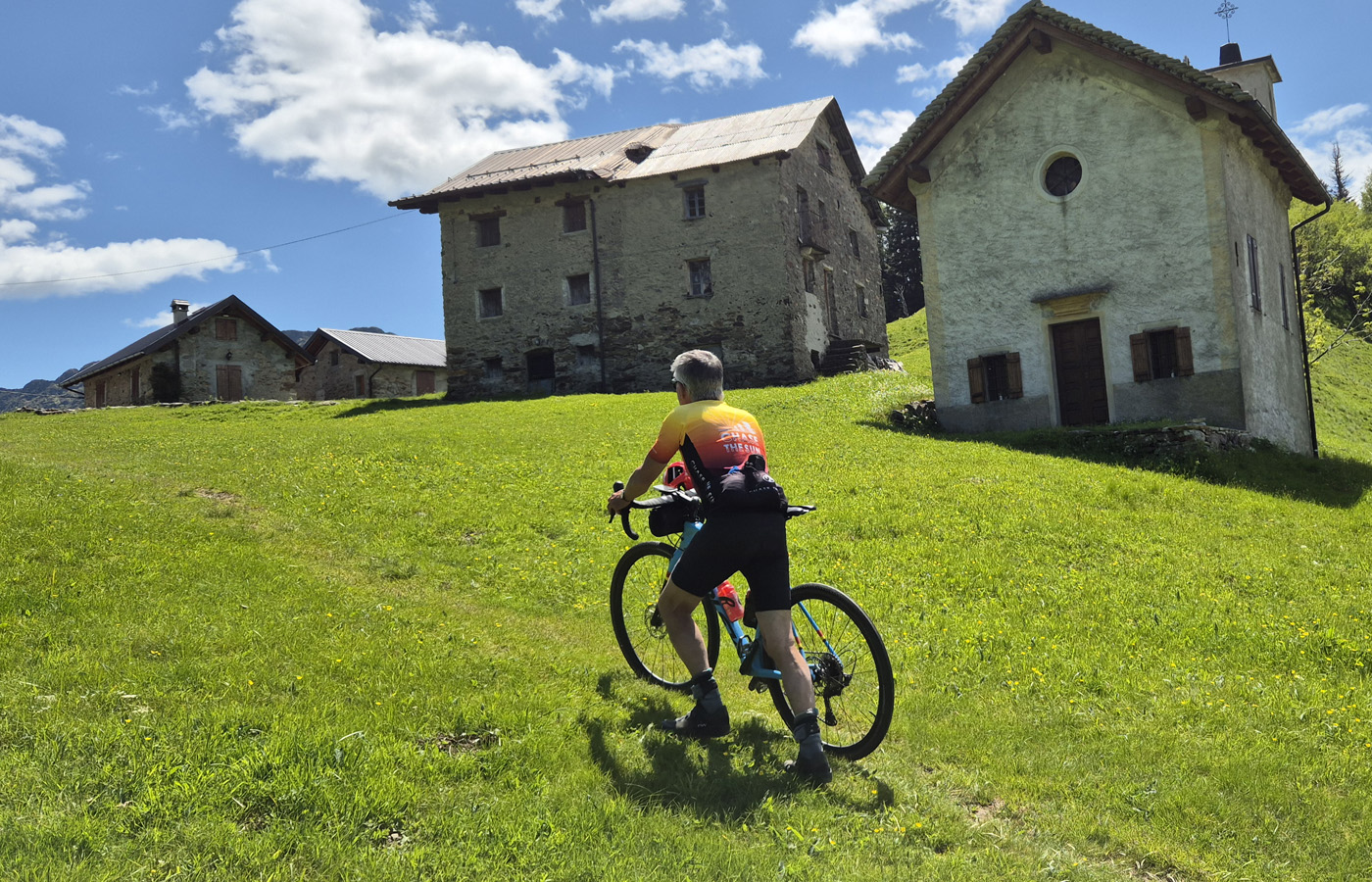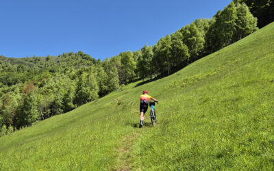 Qui finisce l’asfalto e sono necessarie delle buone scarpe da passeggio per affrontare il tratto cicloalpinistico. Ci sono da superare circa 220 metri di salita per raggiungere il passo La Res (1419 m) dove sui prati del crinale troverete i resti di un alpeggio con bella vista sui due versanti. Sia la salita che la discesa sono poco pedalabili e in alcuni passaggi bisogna portare la bicicletta in spalla.